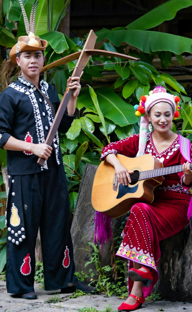 德昂族人口約1.7萬,主要分布在德宏州和保山市的潞西、梁河、瑞麗、隴川、隆陽等縣區(qū)。民居多為草排覆頂竹木結(jié)構(gòu)的干欄式建筑,眼前的德昂村建筑納入了能容納數(shù)十人居住的德昂大房子,氈帽頂?shù)男》孔樱€有頗具浪漫色彩的大公房、小公房……還建有“龍陽塔”標志及佛教奘房、佛塔。德昂族民間普遍信奉南傳佛教,民俗活動與佛事活動關(guān)聯(lián)緊密。潑水節(jié)、開門節(jié)、關(guān)門節(jié)是重大節(jié)日。德昂族服飾色彩豐富,口頭文學(xué)特別是民歌創(chuàng)作活動...